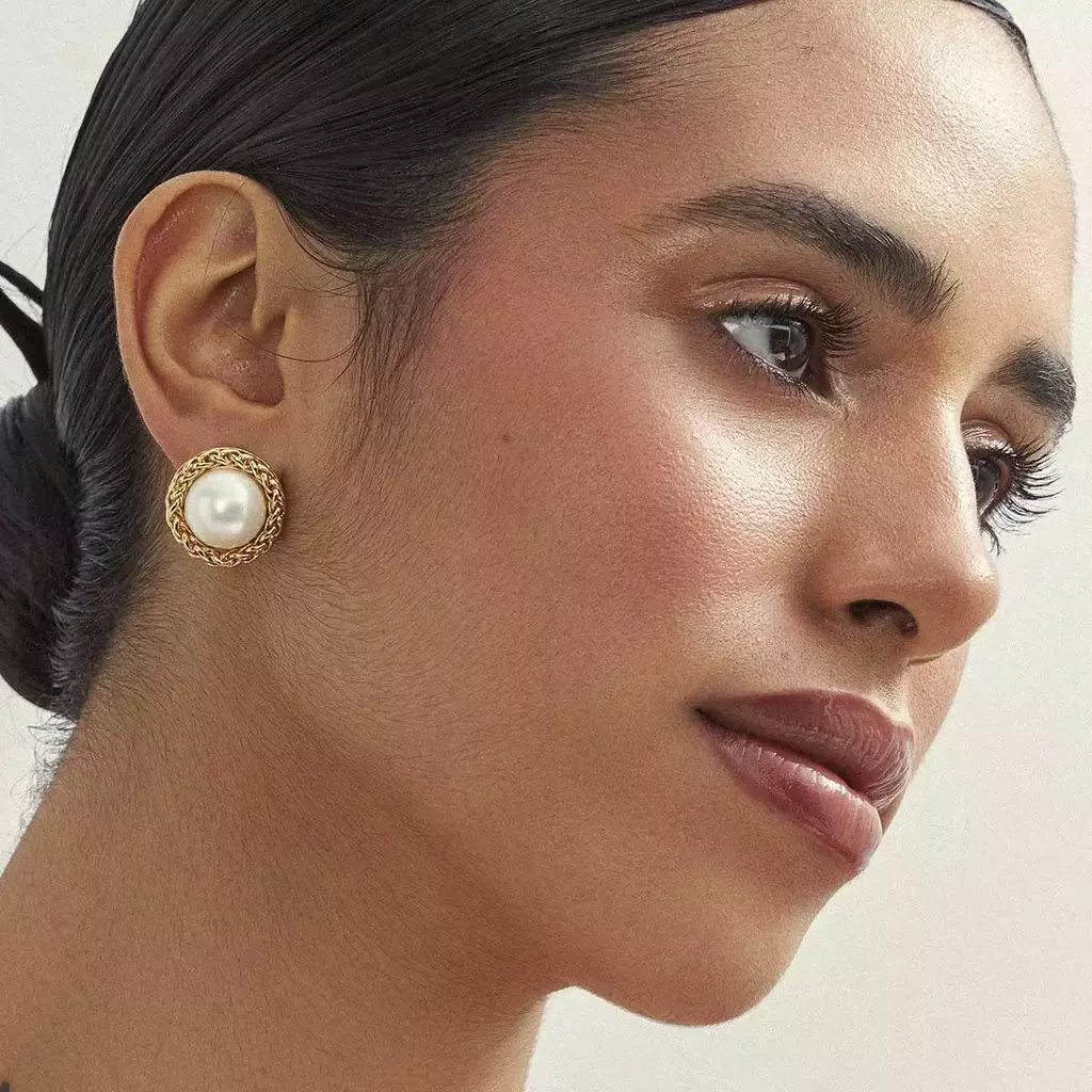 Brinco trançado, vazado, com pérola shell, banhado a ouro. As pérolas também tem significado e simbolismo importante. Representando o símbolo essencial da feminilidade e pureza.